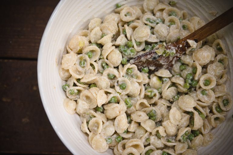 Stir in the cream and ¾ cup of the Pecorino. Simmer until the sauce has thickened slightly, about 4 minutes.