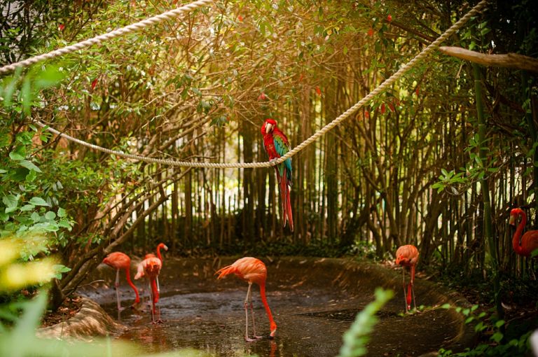 Flamingos are one of my daughter’s favorites. This flamingo enclosure takes the win with this stunning Scarlet Macaw perched above them.