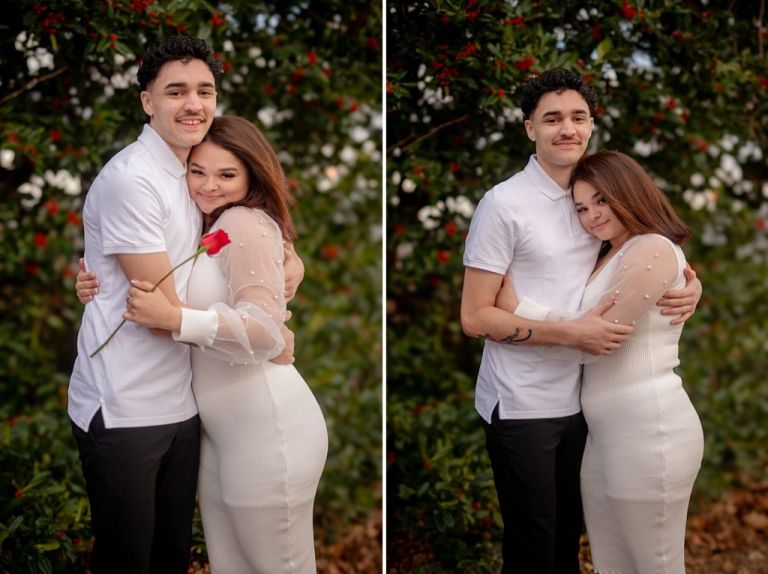 The pop of red from the rose added just enough color with the creamy colors of their outfits and the sleeves of the bride’s dress.