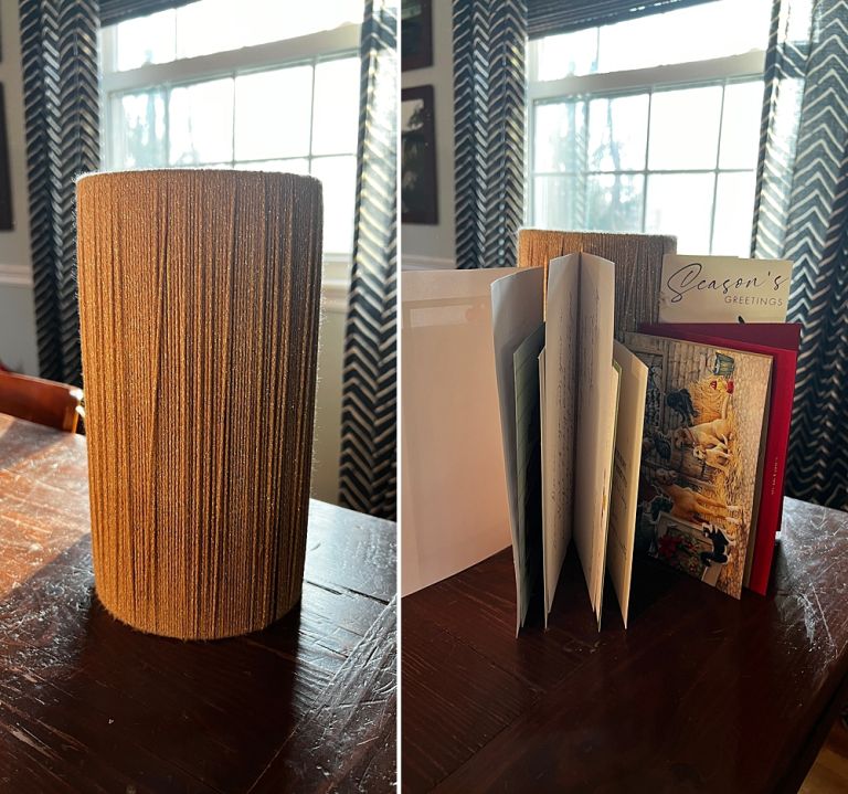 If you have more cards with a traditional, folded design, I have you covered as well. Years ago, my girlfriend my us all these amazing card holders. She took an oatmeal container, spray painted it, and wrapped it in string. It holds SO MANY CARDS and is super easy to make. (Although my girlfriend admitted to having to eat a tremendous amount of oatmeal to make enough gifts for all of us.)