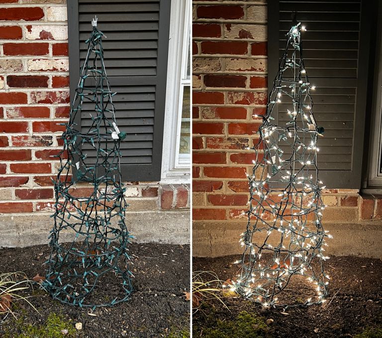 Even if you are not crafty, you can easily make these outdoor Christmas decoration. Simply take a tomato cage and wrap it in lights!!!