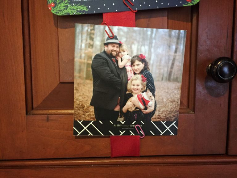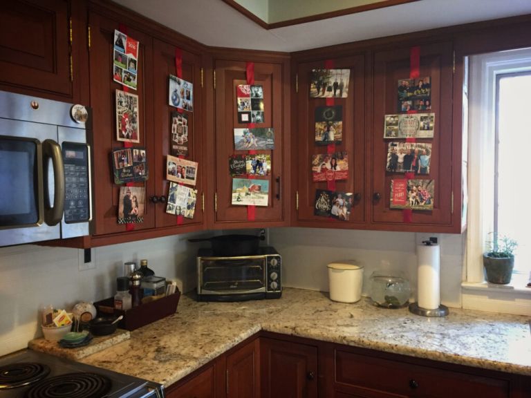 The flat postcard like photo themed holiday cards have become all the rage over the years. I love these cards and seeing my loved ones faces. However, by design, they are not easy to display…until I learn this creative tip. Tape wide ribbon to your kitchen cabinets and attach the cards to the ribbon with paper clips. This allows me to display all of the cards we receive and see these adorable smiling faces while I am puttering around my kitchen.