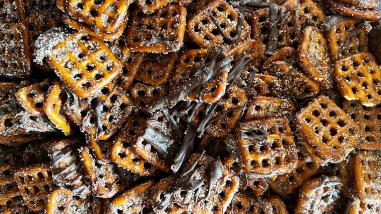 - Melt white chocolate on low heat and drizzle over cooled pretzels.